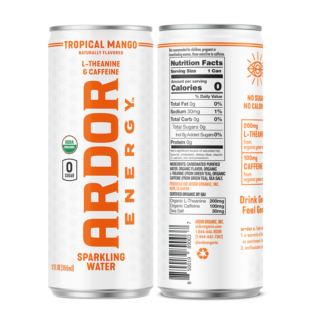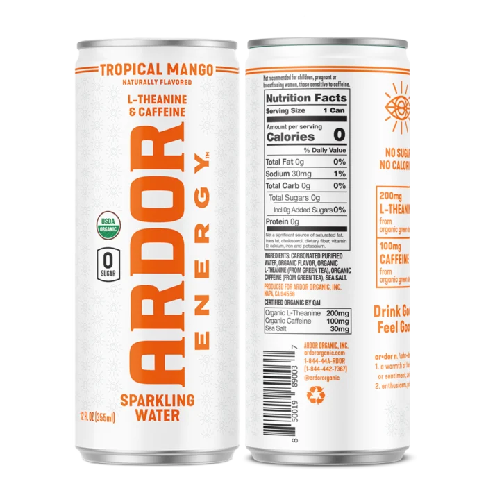 The Ardor Tropical Mango Sparkling Energy Water delivers a juicy, tropical fruit essence with a refreshing effervescent finish and clean functional energy. Crafted with real‑derived organic flavor and a scientifically balanced blend of active ingredients, this ready‑to‑drink energy water offers 100 mg of organic caffeine and 200 mg of L‑theanine per can to help support alertness and calm focus without the typical jitters or crashes associated with conventional energy drinks.