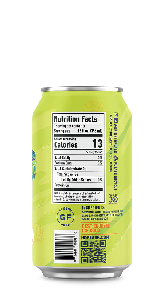 Hoplark 0.0 Hazy Style Sparkling Hop Beverage is a juicy, citrus-forward drink crafted with pineapple and orange juices combined with aromatic hops. It delivers a bright, tropical flavor with a smooth and lightly hoppy finish, creating a refreshing and modern beverage experience.