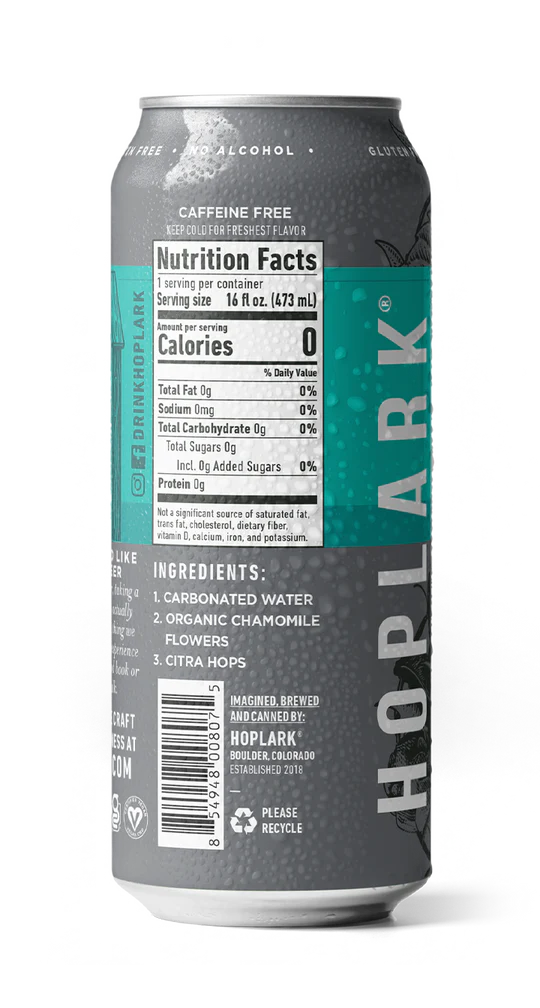 Hoplark The Calm One Sparkling HopTea is a soothing, caffeine-free beverage crafted with organic chamomile flowers and Citra hops. It delivers a light, floral flavor with subtle citrus notes, creating a calm and refreshing drinking experience perfect for unwinding any time of day.