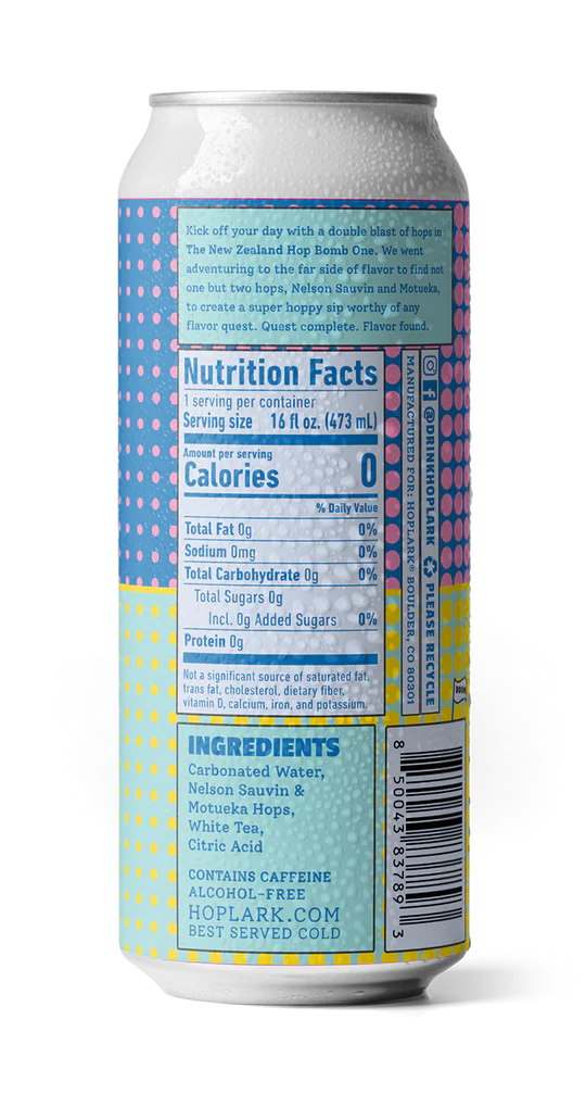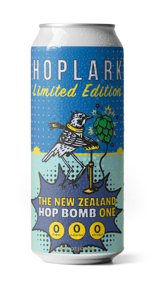 Hoplark The New Zealand Hop Bomb One Sparkling HopTea is a bold, hop-forward beverage crafted with premium New Zealand hops for an intense and aromatic flavor experience. It delivers bright citrusy notes with a lively, slightly resinous finish, creating a crisp and refreshing drink inspired by IPA-style profiles.