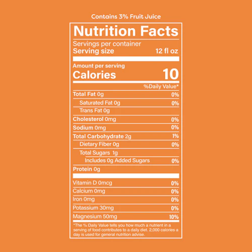 Carbonated Filtered Water, Natural Flavors, Orange Juice Concentrate, Citric Acid, Fruits and Vegetables (for Color), Magnesium Citrate, AlphaWave® L-Theanine, Organic Antrodia Immulink MBG® (70% Beta-1,3/1,6-D-Glucan), Organic Reishi Immulink MBG® (70% Beta-1,3/1,6-D-Glucan), Organic Lion’s Mane Immulink MBG® (70% Beta-1,3/1,6-D-Glucan), KSM-66® Organic Ashwagandha Root Extract, Stevia Leaf Extract, Lemon Balm Extract
