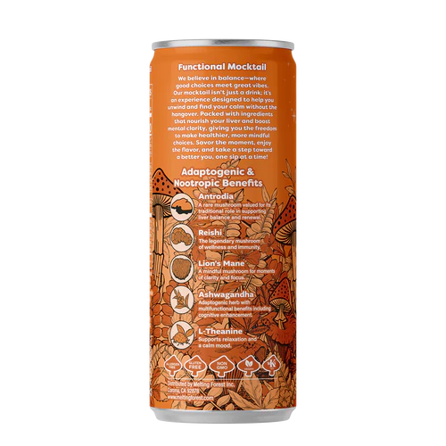 Infused with a functional blend of adaptogens and nootropics, this mocktail is designed to support relaxed focus and balanced wellness. With botanicals like Lion’s Mane and Ashwagandha alongside minerals such as magnesium, it’s ideal for social gatherings, winding down after a long day, or pairing with meals for enhanced enjoyment.