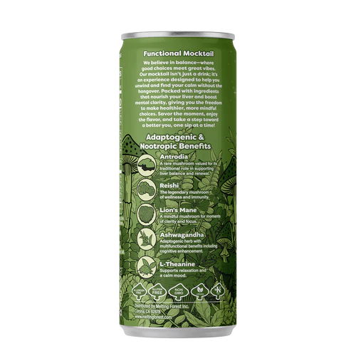 Infused with functional mushrooms such as Reishi, Antrodia, and Lion’s Mane, along with Ashwagandha, L-Theanine, and magnesium, this mocktail supports focus, relaxation, and overall wellness. Perfect for social gatherings, winding down, or pairing with meals, it offers a mindful alternative to traditional cocktails.