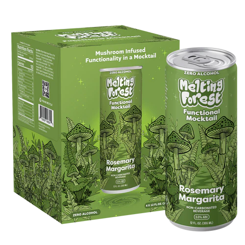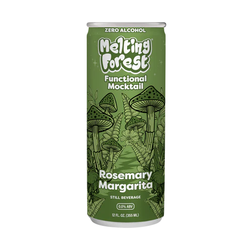 Melting Forest Rosemary Margarita Mushroom Mocktail Drink is a vibrant, alcohol-free sparkling beverage inspired by the classic margarita. It blends bright hibiscus floral notes with a tangy citrus finish for a refreshing and sophisticated drinking experience, all with only 10 calories per can.