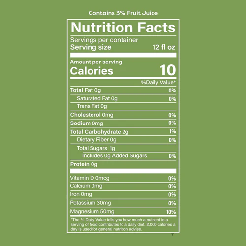 Carbonated Filtered Water, Natural Flavors, Apple Juice Concentrate, Citric Acid, Fruits and Vegetables (for Color), Magnesium Citrate, AlphaWave® L-Theanine, Organic Antrodia Immulink MBG® (70% Beta-1,3/1,6-D-Glucan), Organic Reishi Immulink MBG® (70% Beta-1,3/1,6-D-Glucan), Organic Lion’s Mane Immulink MBG® (70% Beta-1,3/1,6-D-Glucan), KSM-66® Organic Ashwagandha Root Extract, Stevia Leaf Extract, Lemon Balm Extract