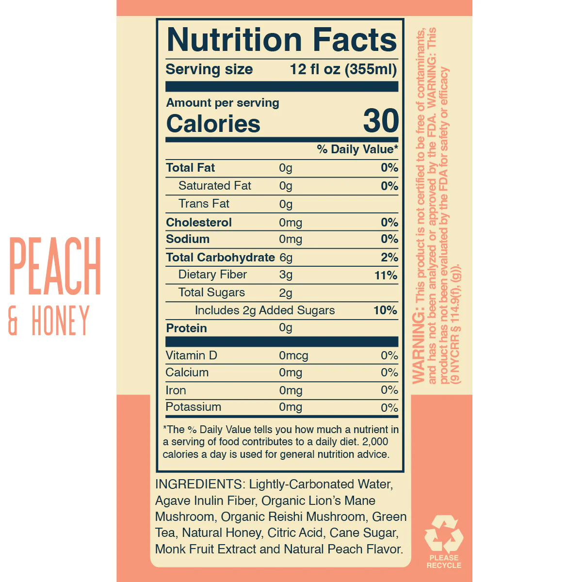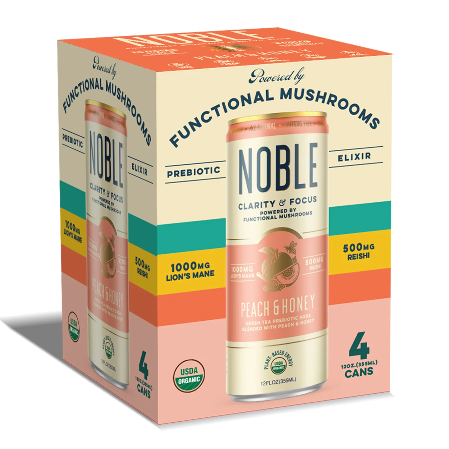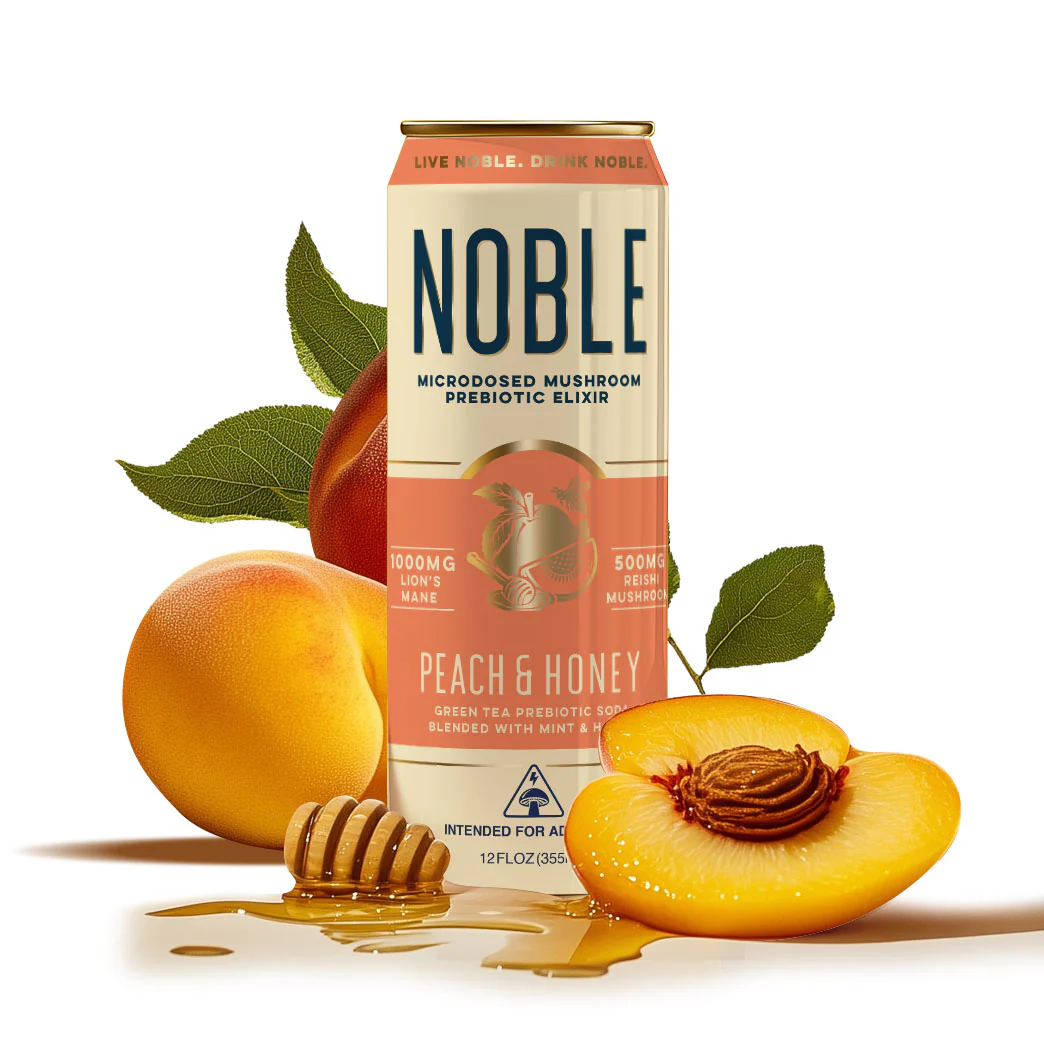 Noble Elixirs Peach & Honey Functional Mushroom Elixir combines the sweet, juicy flavor of ripe peaches with rich honey notes for a balanced and refreshing functional drink. This beverage pairs bright fruit character with gentle sweetness, creating a smooth and enjoyable taste experience that’s satisfying without heaviness.