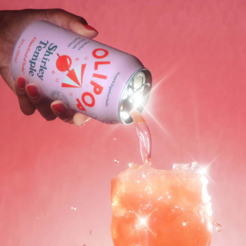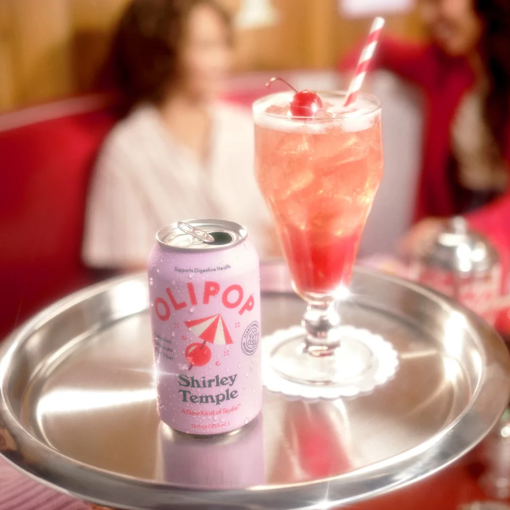 Olipop Shirley Temple Sparkling Prebiotic Soda is a nostalgic, limited-edition flavor inspired by the classic mocktail. It blends bright citrus notes of lemon and lime with smooth vanilla and a cherry finish for a refreshing and slightly creamy soda experience.