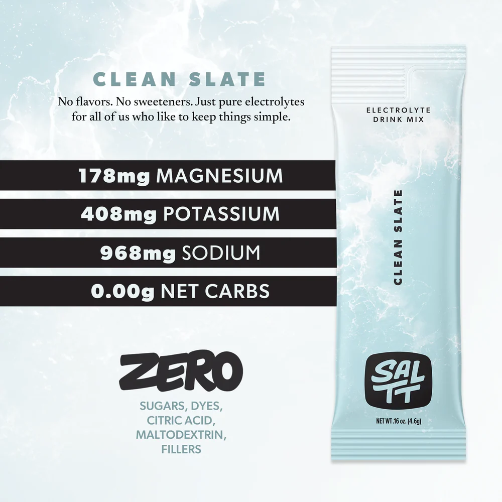 SALTT Clean Slate Unflavored Electrolyte Drink Mix is a simple, unflavored hydration powder made for customers who want pure electrolytes without sweeteners, flavors, or unnecessary additives. The official product page describes it as “No flavor, no sweeteners. Just pure electrolytes”, making it a strong fit for shoppers searching for unflavored electrolyte powder, clean hydration packets, and daily mineral support in a convenient stick format.