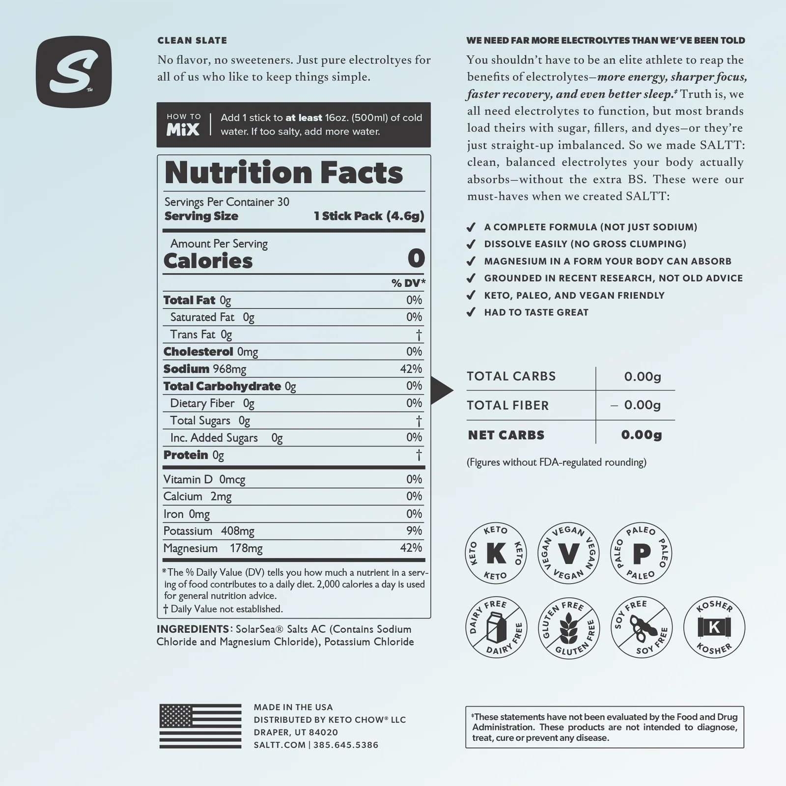 Each serving provides 968mg sodium, 408mg potassium, and 178mg magnesium, with 0 calories, 0g carbohydrates, 0g sugar, and 0g added sugar per stick according to the visible nutrition panel. SALTT also highlights features such as easy dissolve, no clumping, zero sugar, zero dyes, zero citric acid, and zero maltodextrin, which gives this product strong relevance for clean-label hydration and electrolyte replacement searches.