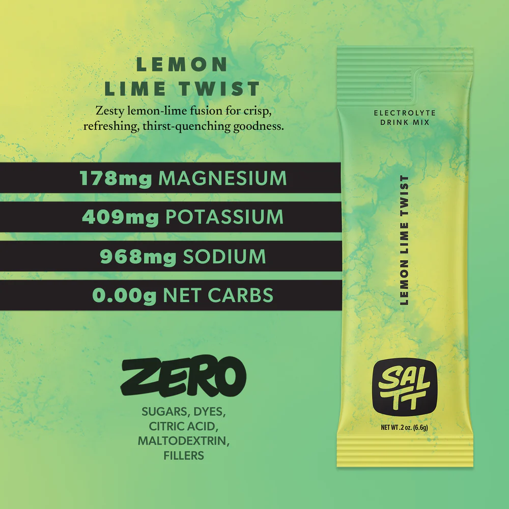 SALTT Lemon Lime Twist Electrolyte Powder Drink Mix is a lemon-lime hydration powder designed for daily electrolyte replenishment, workouts, travel, and active routines. The official product page describes it as a “zesty lemon-lime fusion for crisp, refreshing, thirst-quenching goodness” and sells it in convenient stick packs, making it a strong fit for shoppers searching for lemon lime electrolyte packets, hydration powder sticks, and clean drink mix options.