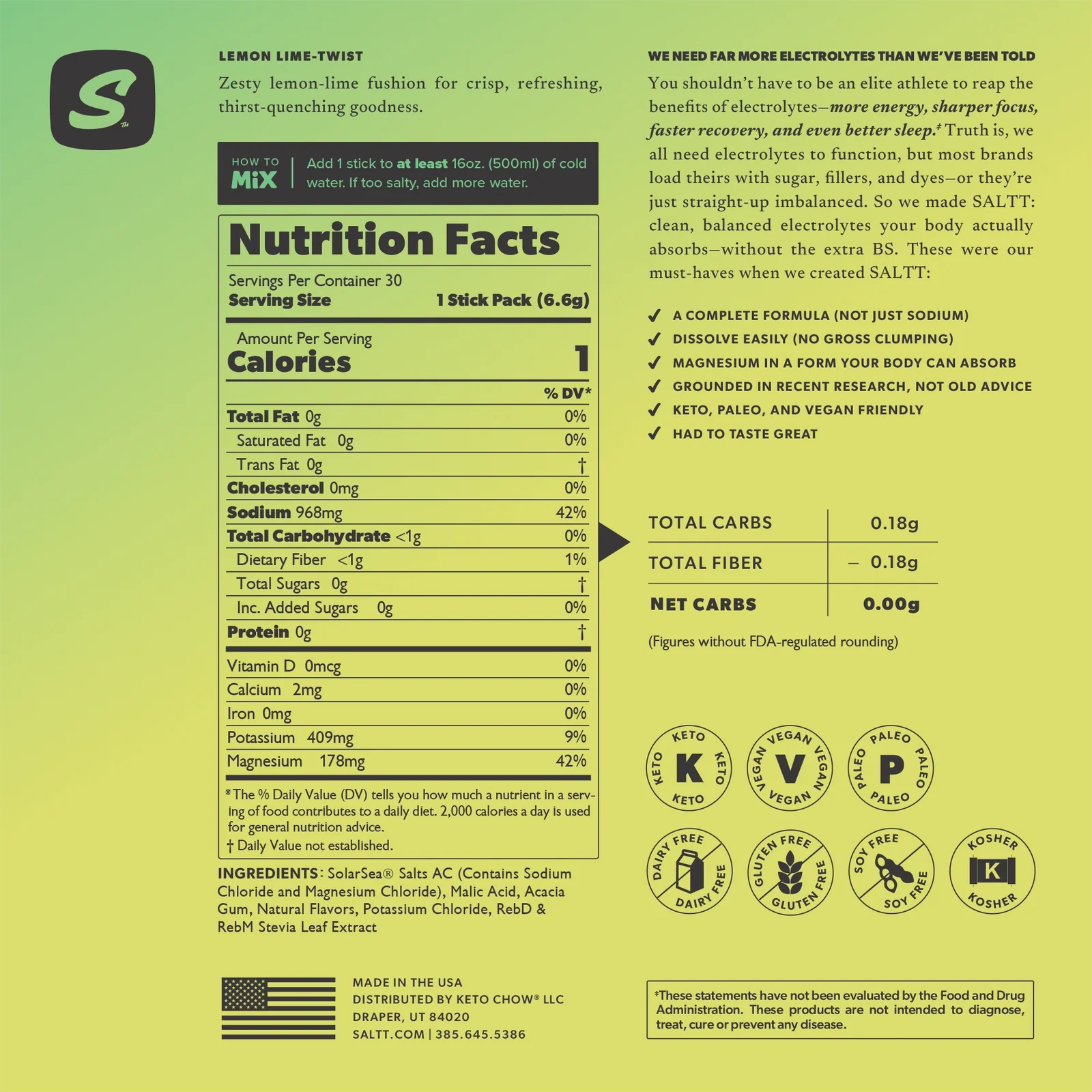 Each serving provides 968mg sodium, 409mg potassium, and 178mg magnesium, along with 1 calorie, 0g sugar, and 0g added sugar according to the visible nutrition facts panel. SALTT also highlights easy dissolve, no clumping, zero sugar, zero dyes, zero citric acid, and zero maltodextrin, which makes this product a strong match for clean-label hydration and electrolyte replacement searches.