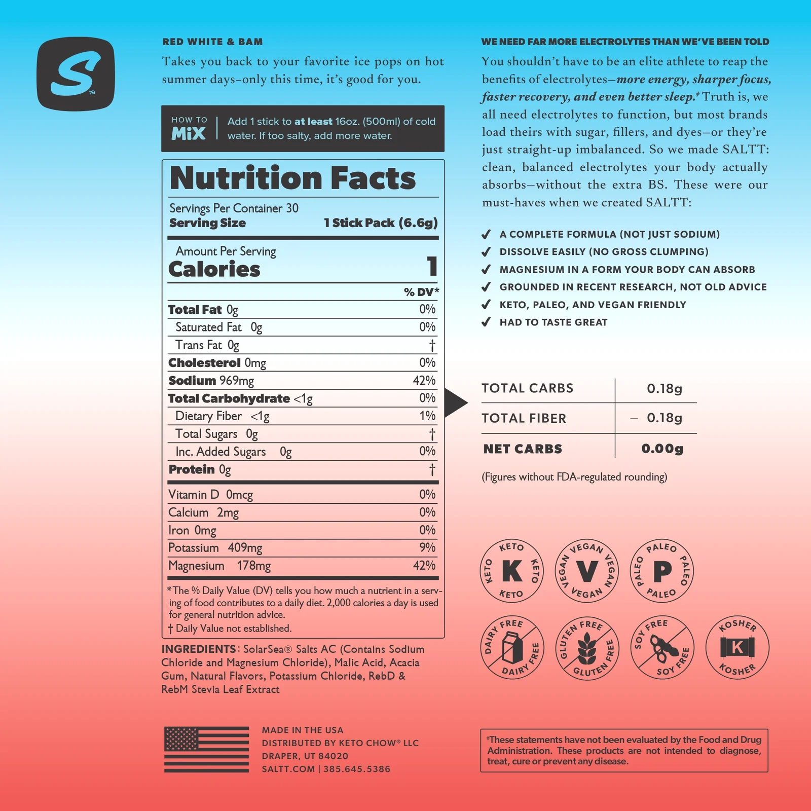SALTT Red White & Bam Electrolyte Powder Drink Mix is an ice-pop-inspired hydration powder made for daily electrolyte replenishment, workouts, travel, and active routines. The official product page describes it as having “pure ice pop vibes” and sells it in convenient stick packs, making it a strong fit for shoppers searching for electrolyte packets, hydration powder sticks, and clean drink mix options in a single-serve format.