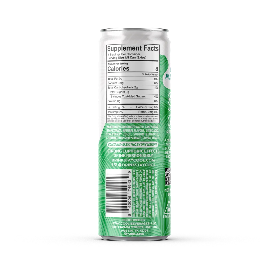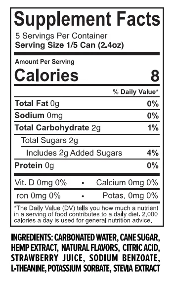 Carbonated Water, Cane Sugar, Hemp Extract, Natural Flavors, Citric Acid, Strawberry Juice, Sodium Benzoate, L-Theanine, Potassium Sorbate, Stevia Extract